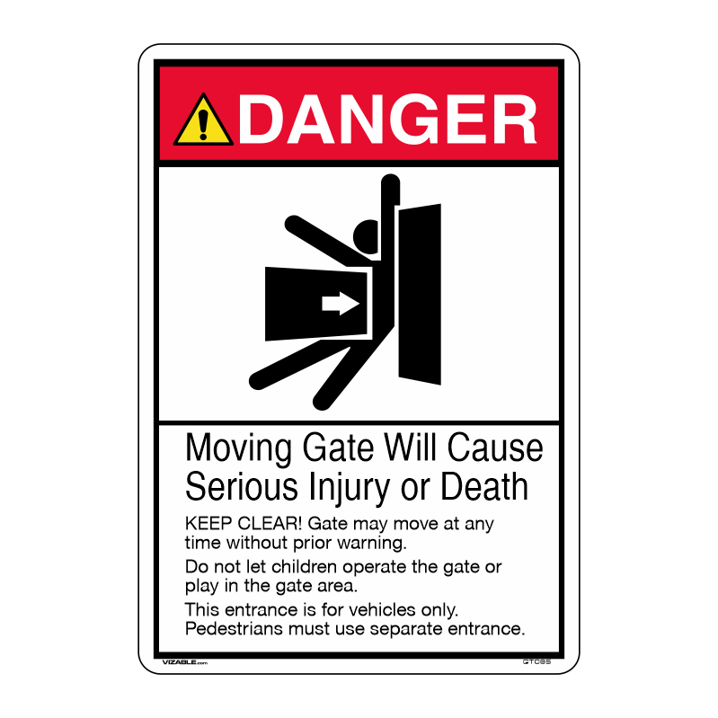 DOOR & GATE SAFETY – Danger – Moving Gate Will Cause Serious Injury Or Death w/Symbol